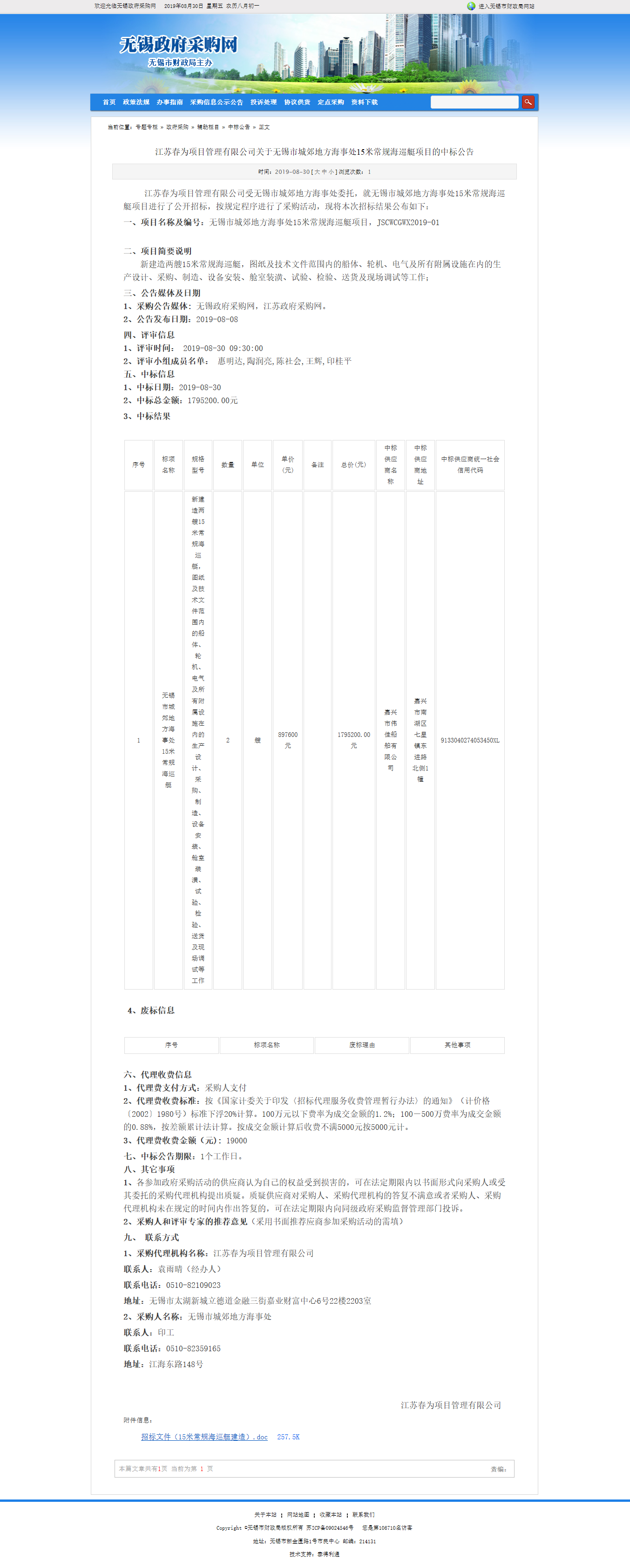 中标公告(无锡市城郊地方海事处15米常规海巡艇项目)