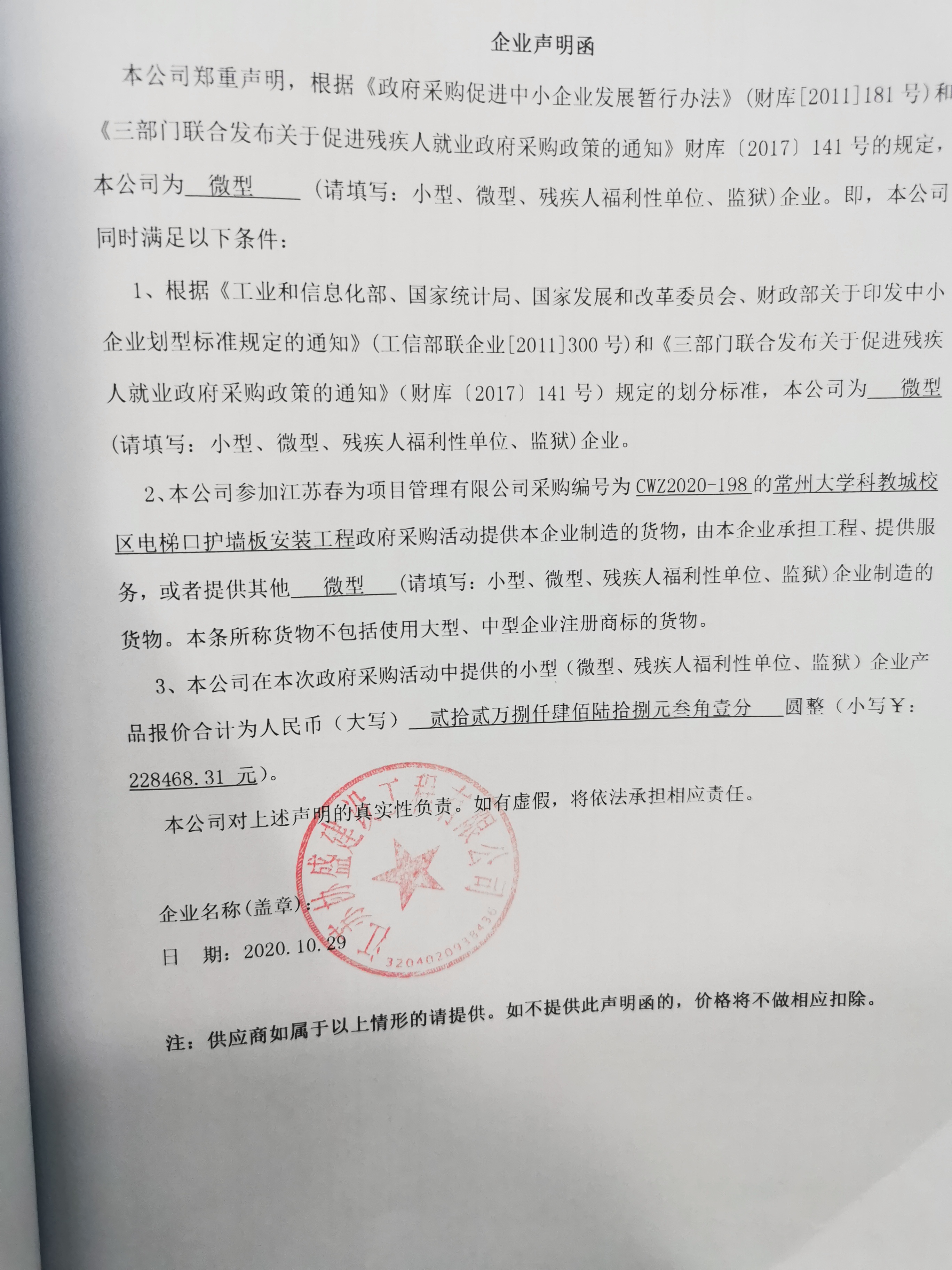 常州大学科教城校区电梯口护墙板安装工程中标公告